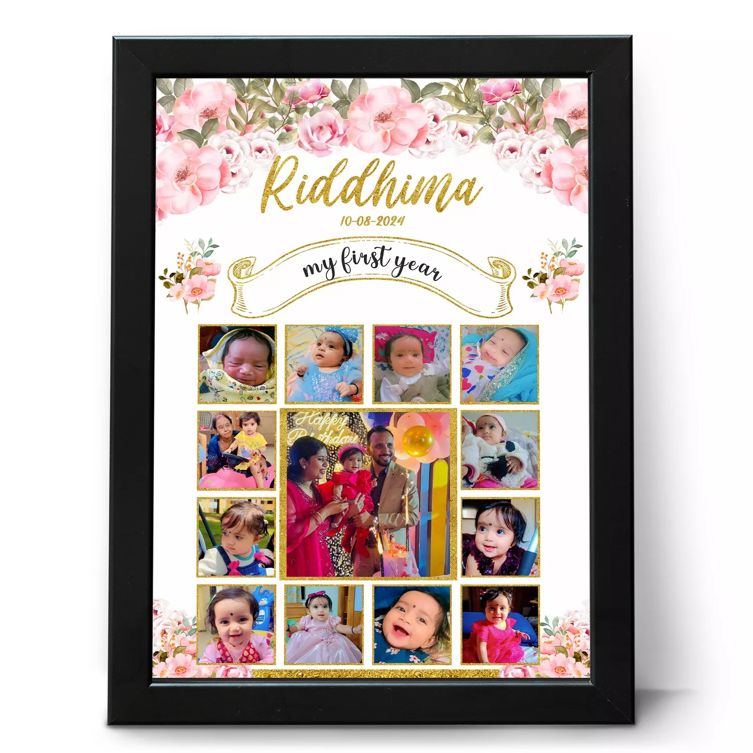 Capture your babyโs beautiful journey from newborn to 1 year with this customized 12 month photo collage frame. Designed to showcase 12 milestone photos along with babyโs name and birth date, this frame becomes a timeless keepsake for parents and families.