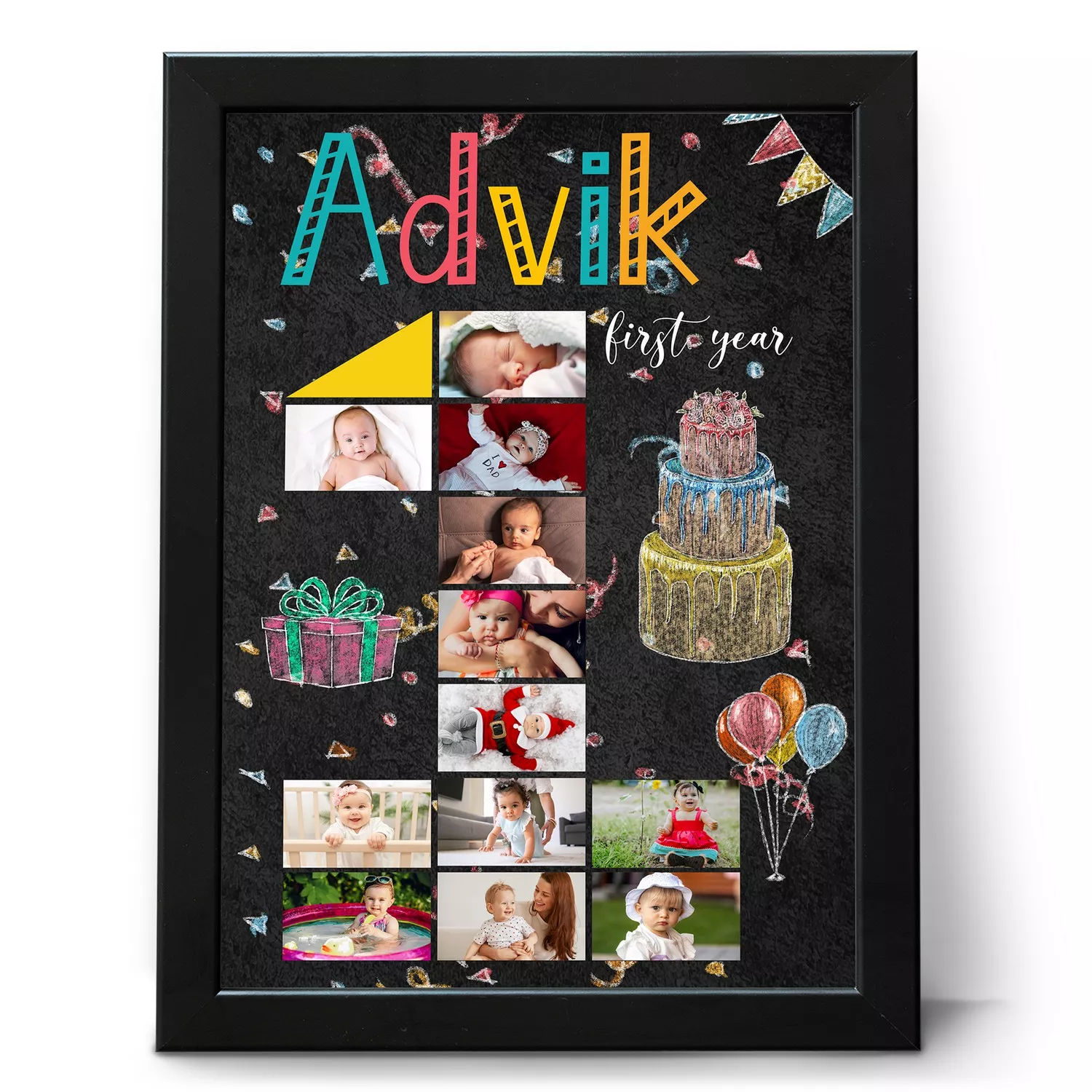 The design features a chalkboard-style background with playful birthday illustrations, making it ideal for a first birthday celebration or nursery décor. You can customize it with your baby’s name for a meaningful and memorable touch.