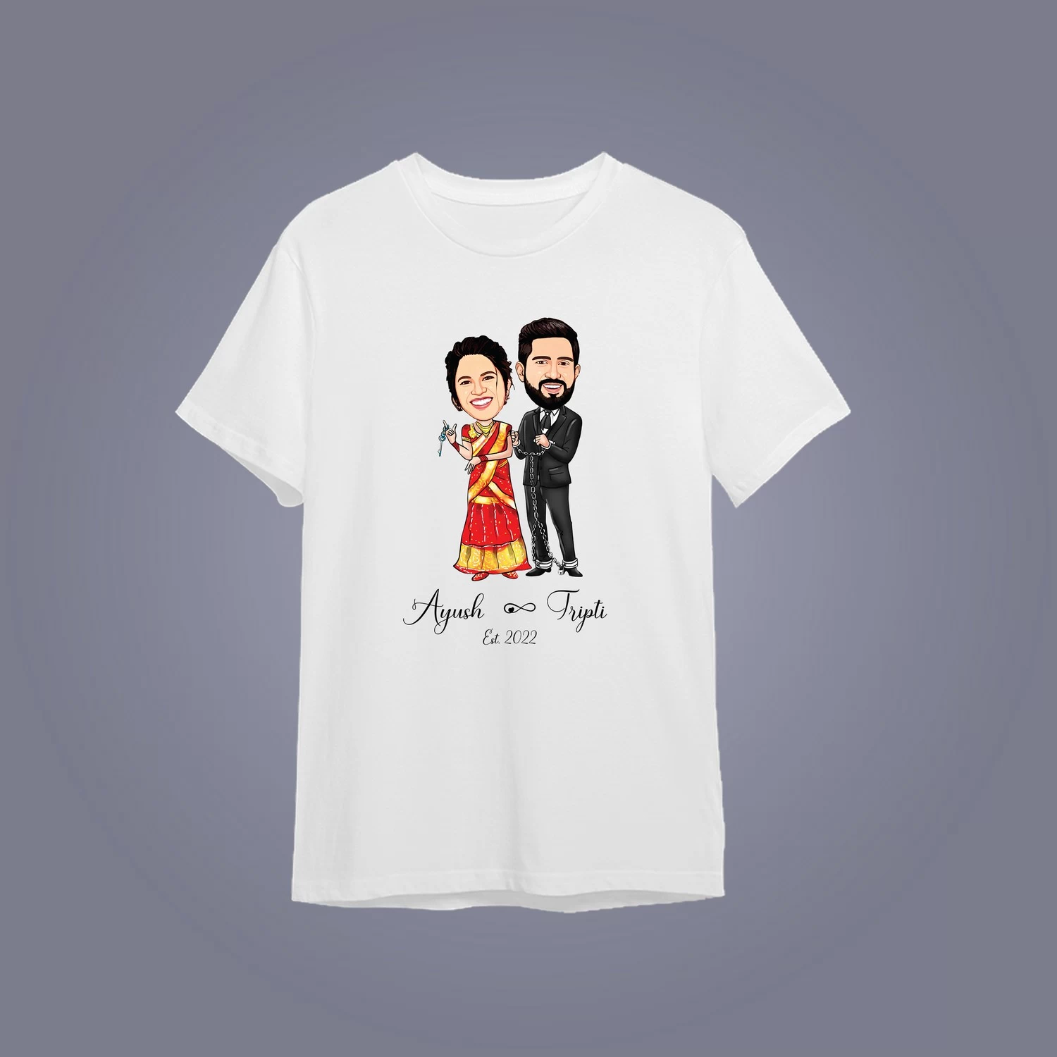 Celebrate your love story with a custom caricature couple T-shirt designed specially for you. This personalized matching T-shirt features a cute illustrated couple design along with your names and special date, making it perfect for couples who want a unique and memorable outfit.