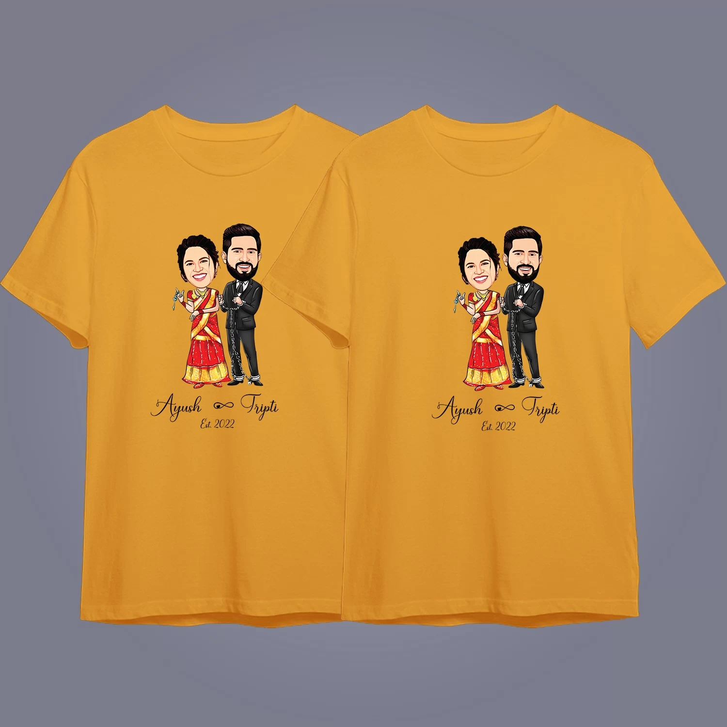 Absolutely! We have a wide range of matching couple T-shirts for anniversaries, pre-wedding shoots, honeymoons, and special celebrations. You can also request custom designs for your unique occasion.