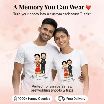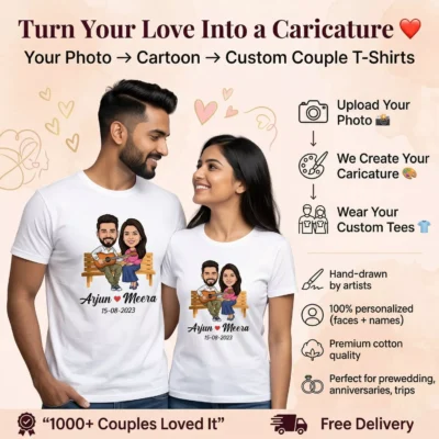 Celebrate your love story with a custom caricature couple T-shirt designed specially for you. This personalized matching T-shirt features a cute illustrated couple design along with your names and special date, making it perfect for couples who want a unique and memorable outfit.