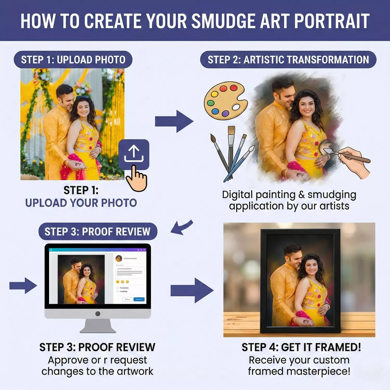 Whether it's your first photo together, a wedding memory, or a special moment โ€” transform it into a beautiful smudge art frame that lasts forever.