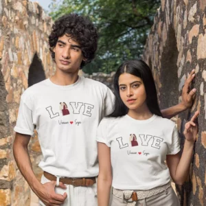 The design blends a minimal “LOVE” typography with a couple illustration, making it modern, stylish, and deeply personal. Your names printed below create a unique identity that no off-the-shelf T-shirt can match.