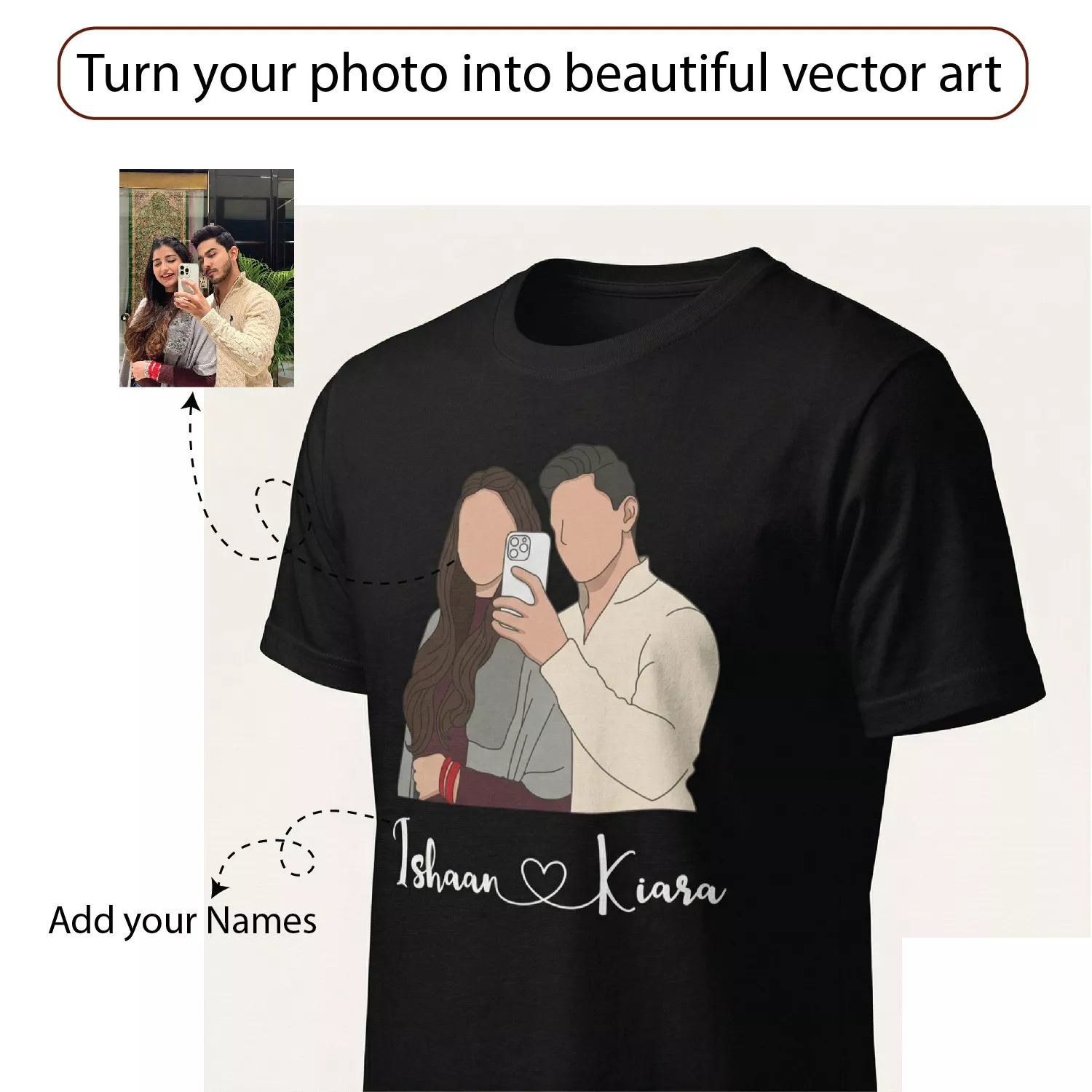 This personalized couple T-shirt transforms your relationship into a stylish illustration that feels intimate, modern, and meaningful.
