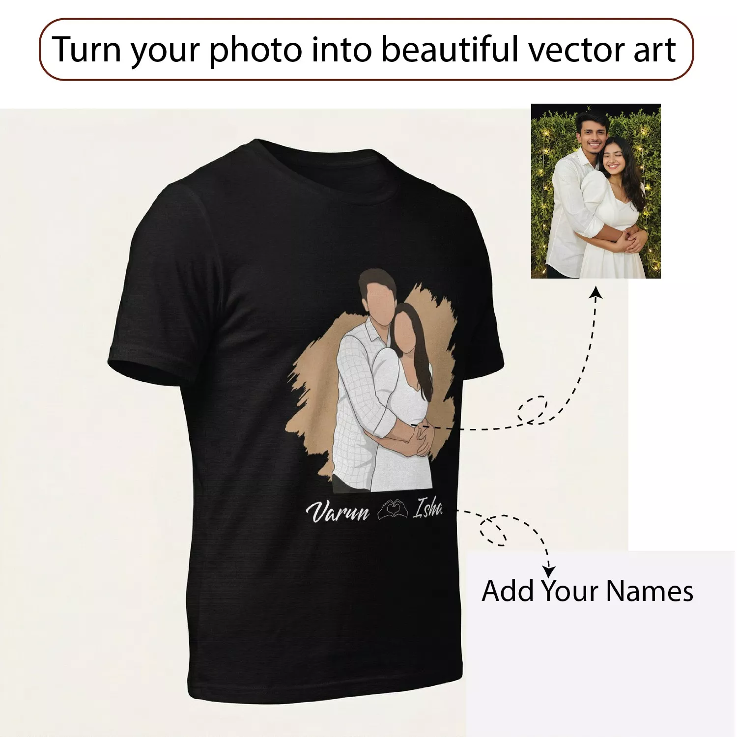 Add your names and create a t-shirt that feels like your relationship—simple, real, and meaningful.