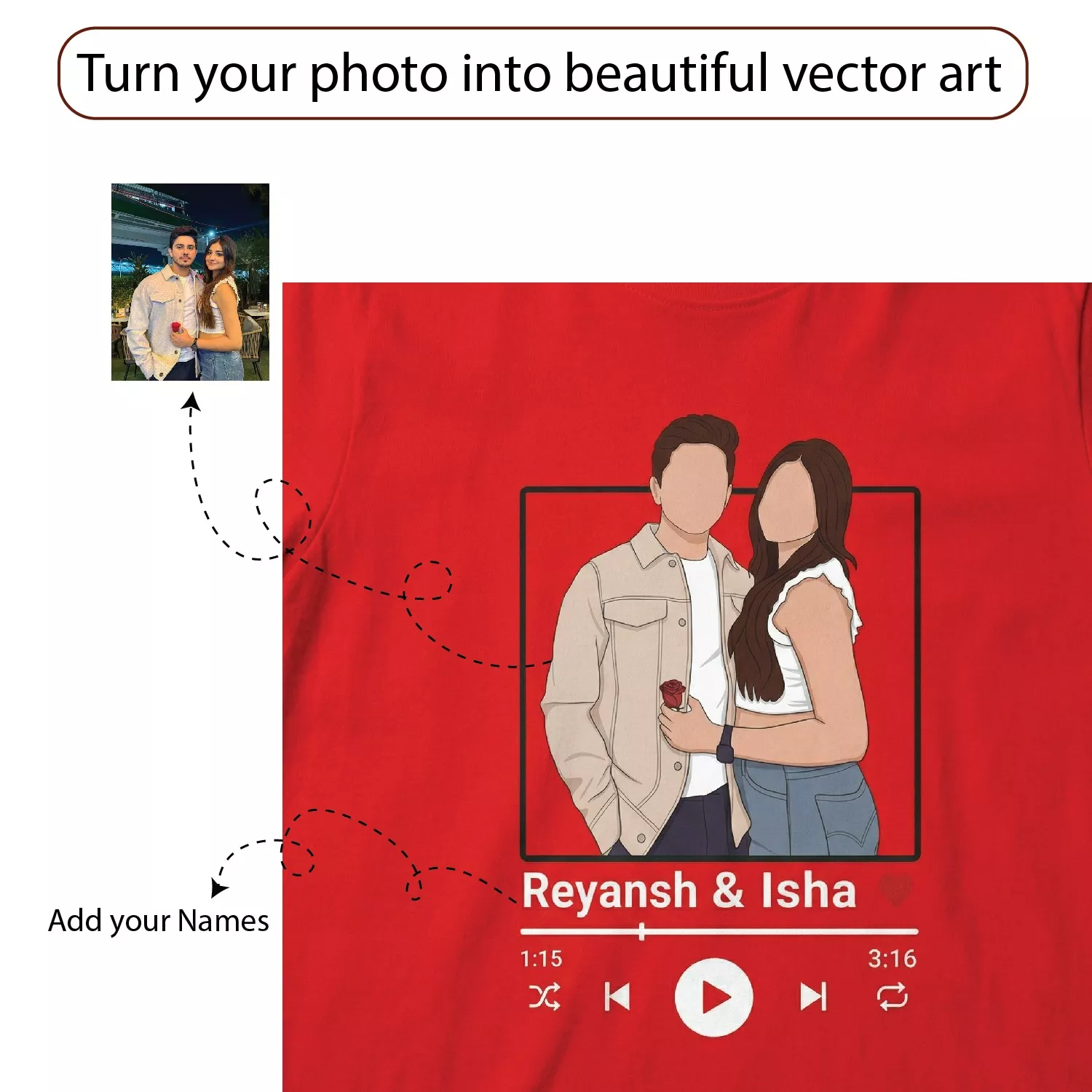Capture your relationship in stunning line art and vector illustration styles with custom couple T-shirts designed from your names or photos. Perfect for prewedding shoots, anniversaries, or creating a unique, eye-catching couple look.