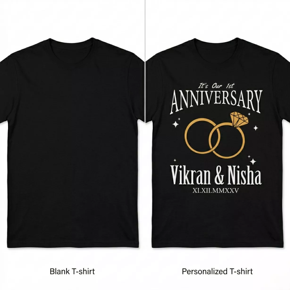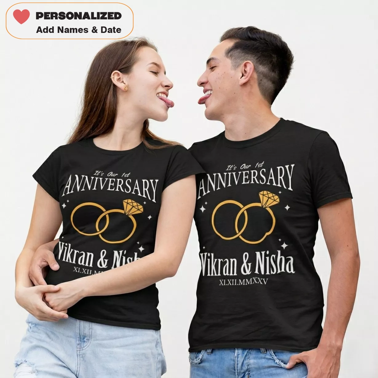 Personalized couple T-shirts for married couples celebrating their 1st anniversary and looking for matching outfits for special moments.