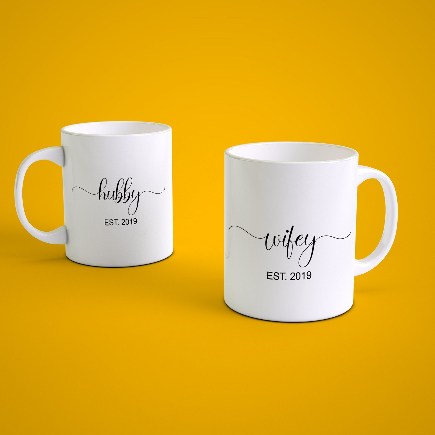 Celebrate your love story with this elegant personalized couple mug set designed for husbands and wives. Featuring stylish “Hubby” and “Wifey” typography along with a customizable establishment year, these mugs make a meaningful gift for couples who enjoy starting their day together.