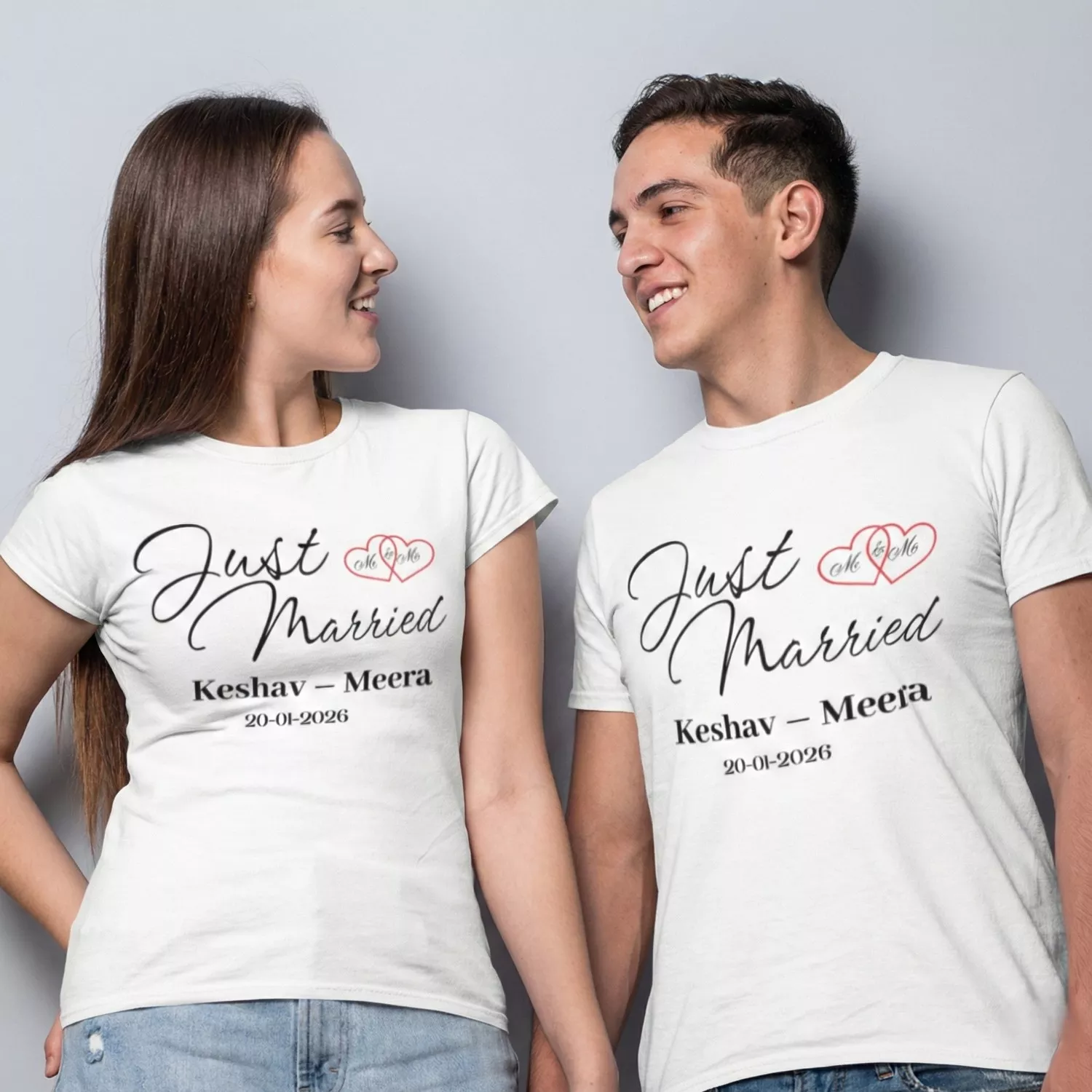 Celebrate your love story in style with our Personalized Just Married Couple T Shirts – specially designed for newlyweds in India. This elegant script-style design features “Just Married” typography with custom names and wedding date, making it a perfect honeymoon outfit or wedding keepsake.