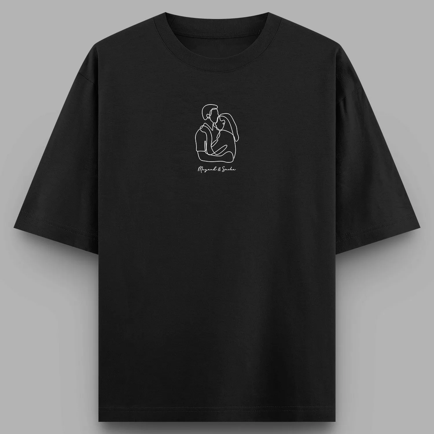 Celebrate your relationship with these personalized oversized couple t-shirts featuring an elegant minimalist line art couple illustration and custom names printed below the design. The oversized fit adds a modern streetwear style while making the outfit comfortable for everyday wear, photoshoots, vacations, and special occasions.