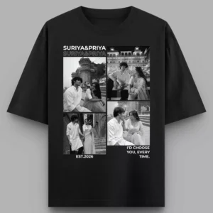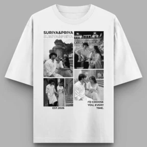 Celebrate your relationship with custom oversized couple T-shirts designed using your favorite memories. This personalized photo collage design features your photos, names, and a meaningful quote, making it a unique wearable keepsake for couples.